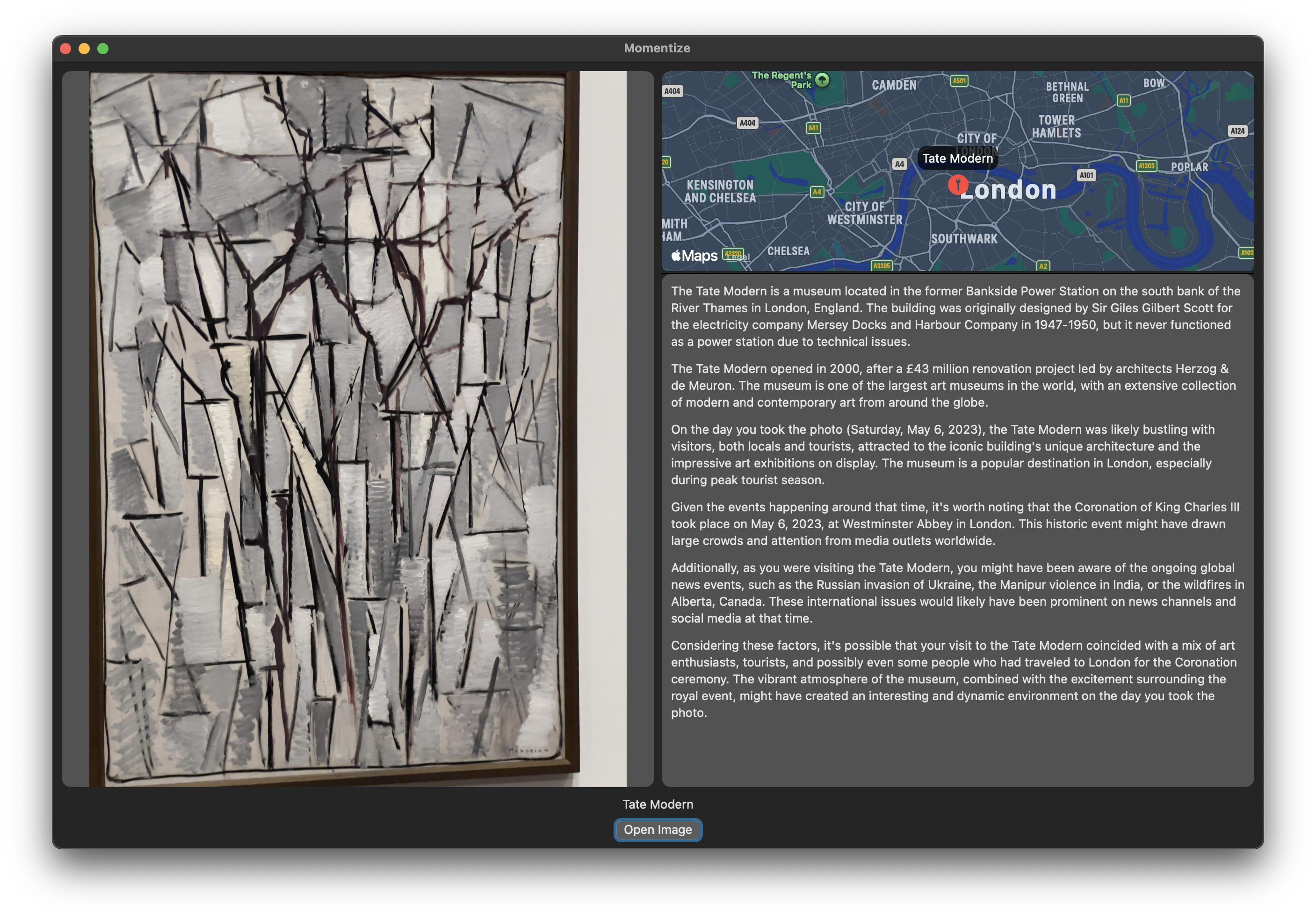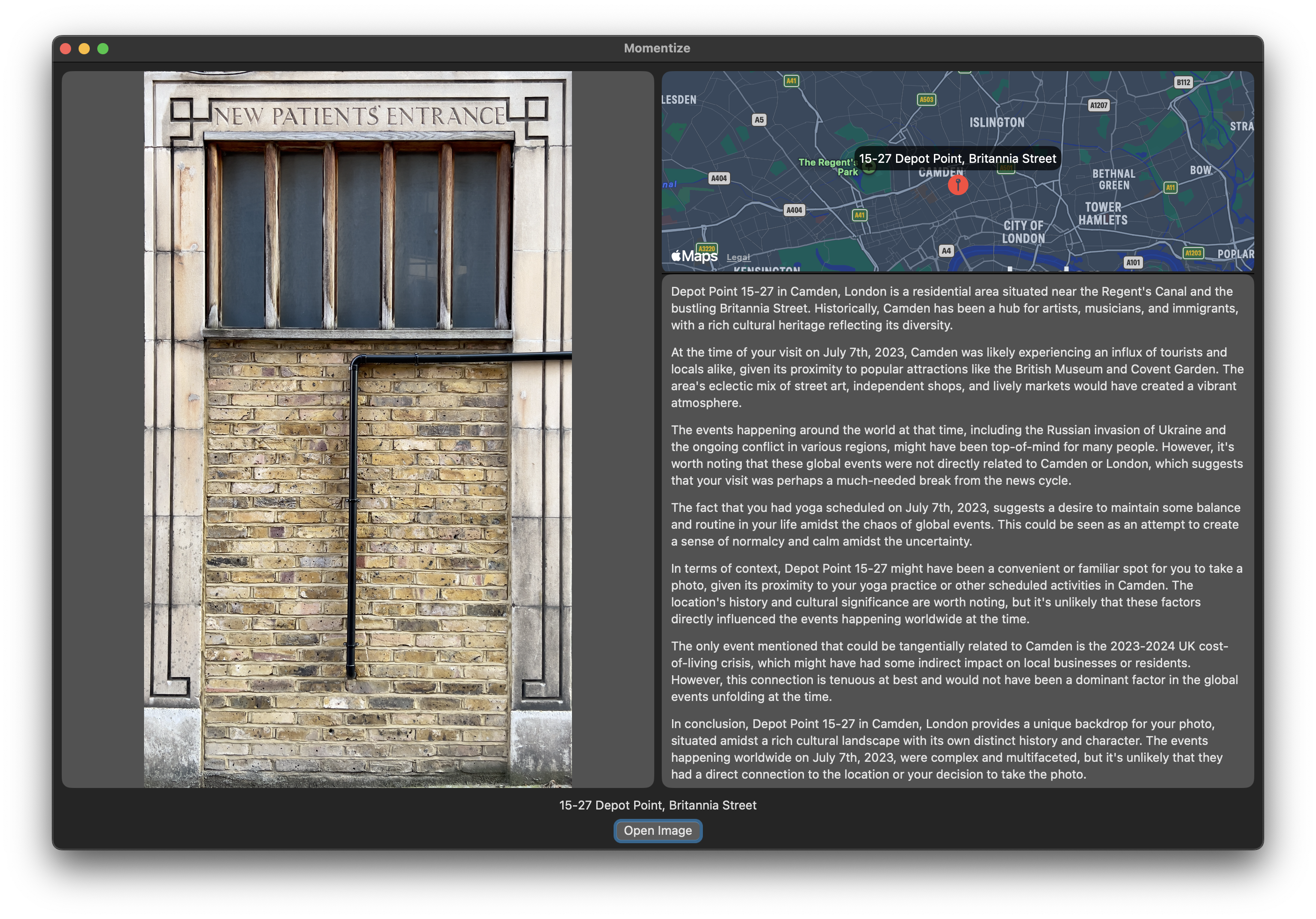 I made a macOS app in SwiftUI. It would take an image, extract metadata, and assemble a prompt like: "I need to refresh my memory. I have this photo, but I can't remember taking it. Can you give this photo some context so that I can remember the moment? I know I took it at this location on..."